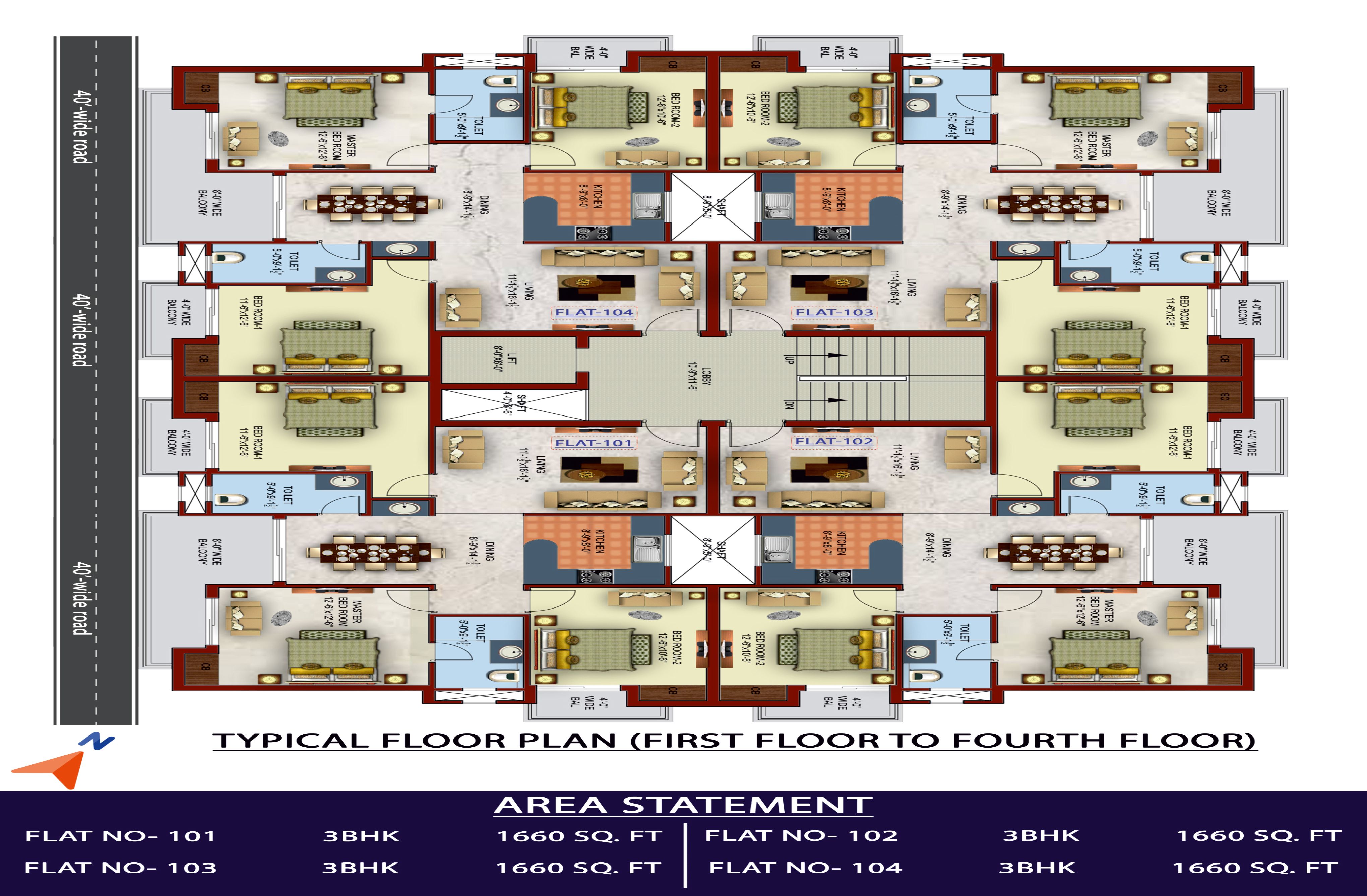 Type 3 BHK Flats / Apartments | Builtup Area 1600 Sq.ft. | Price Call for Price | Floor Plan